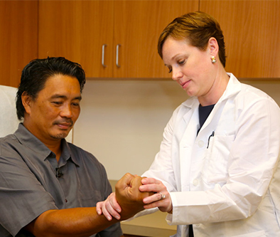 Pictured: Dr. Alyssa Carnegie examines a patient to assess if he is a candidate for endoscopic carpal tunnel release.